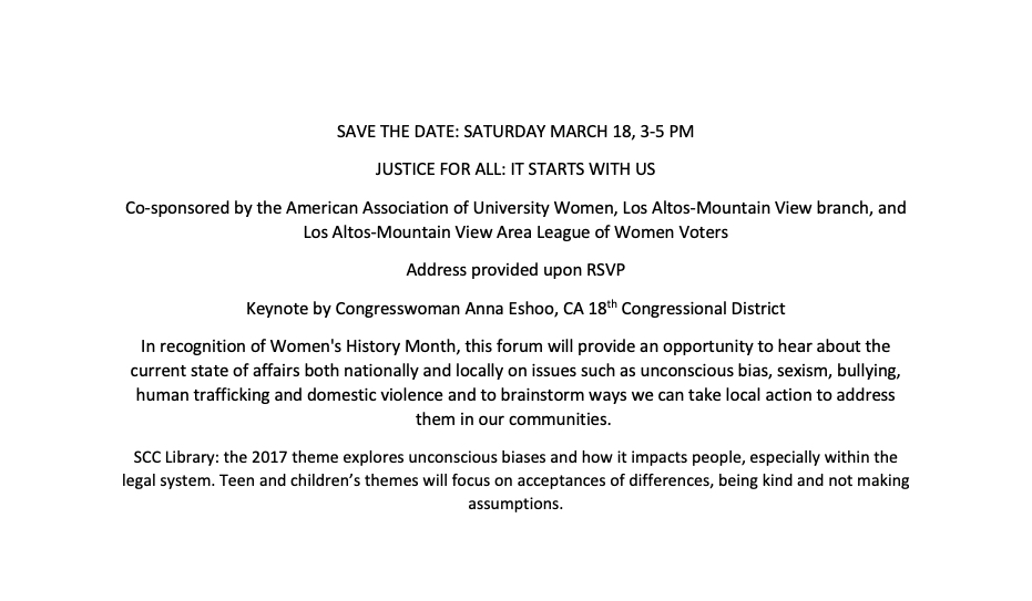 Co-sponsored by the American Association of University Women, Los Altos-Mountain View branch, and Los Altos-Mountain View Area League of Women Voters. Address provided upon RSVP. Please RSVP via Contact Us link
